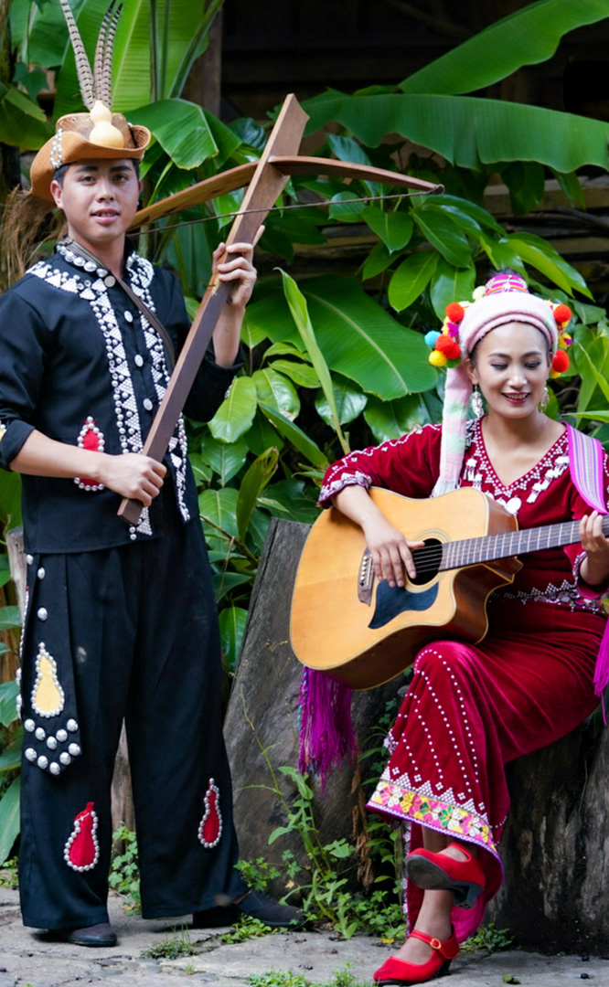 德昂族人口約1.7萬,主要分布在德宏州和保山市的潞西、梁河、瑞麗、隴川、隆陽等縣區(qū)。民居多為草排覆頂竹木結(jié)構(gòu)的干欄式建筑,眼前的德昂村建筑納入了能容納數(shù)十人居住的德昂大房子,氈帽頂?shù)男》孔樱€有頗具浪漫色彩的大公房、小公房……還建有“龍陽塔”標(biāo)志及佛教奘房、佛塔。德昂族民間普遍信奉南傳佛教,民俗活動(dòng)與佛事活動(dòng)關(guān)聯(lián)緊密。潑水節(jié)、開門節(jié)、關(guān)門節(jié)是重大節(jié)日。德昂族服飾色彩豐富,口頭文學(xué)特別是民歌創(chuàng)作活動(dòng)...